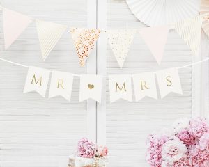 Svadobná dekorácia – banner MR & MRS so zlatým metalickým písmom. Banner sa hodí k jemne a elegantne ladenej výzdobe.