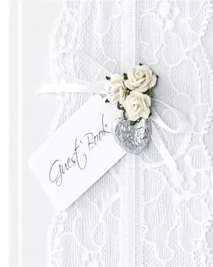 Svadobná kniha hostí v elegantnej kombinácií bielej s čipkou na prednej obálke. Svadobná kniha uchová spomienky a priania na 22 čistých listoch.