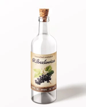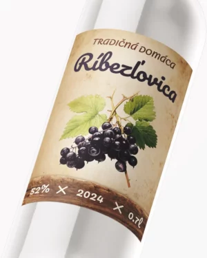 Originálna samolepiaca etiketa na pálenku s motívom čiernych ríbezlí.