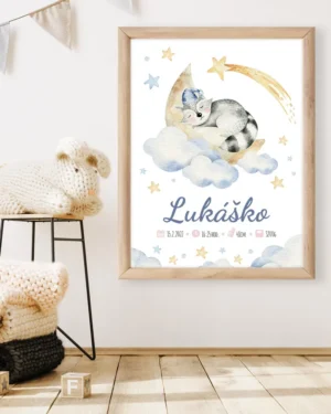 Obraz do detskej izby s detským motívom. Obraz je vyrobený na mieru s menom, podľa vášho zadania môže ale aj nemusí obsahovať ďalšie údaje ako dátum a čas narodenia, výšku a váhu.
