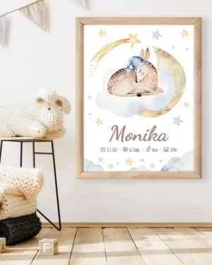 Obraz do detskej izby alebo a plagát s detským motívom. Obraz je vyrobený na mieru s menom, podľa vášho zadania môže ale aj nemusí obsahovať ďalšie údaje ako dátum a čas narodenia, výšku a váhu.