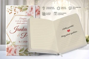 Personalizovaný svadobný zápisník – unikátny darček pre hostí s vlastným textom. Elegantná a praktická pamiatka zo svadby v ideálnom rozmere  92x142mm (cca A6 formát).