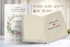 Personalizovaný svadobný zápisník – unikátny darček pre hostí s vlastným textom. Elegantná a praktická pamiatka zo svadby v ideálnom rozmere  92x142mm (cca A6 formát).
