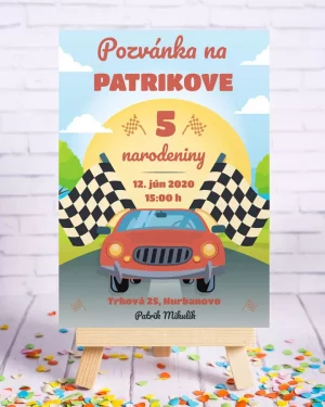 Originálna narodeninová pozvánka na detskú oslavu vhodná chlapcov s motívom pretekárskeho auta.
