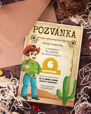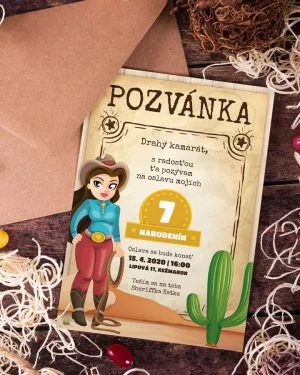Originálna narodeninová pozvánka na detskú oslavu s témou divokého západu. Na výber motív pre chlapcov aj dievčatá. Pozvánka je tlačené v štandardnom rozmere A6 – 105x148mm.