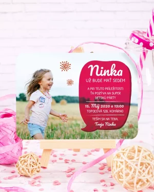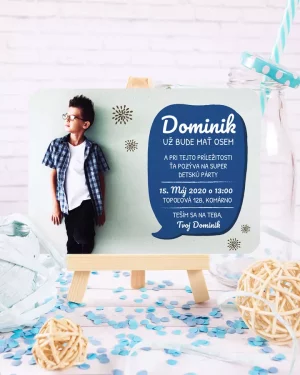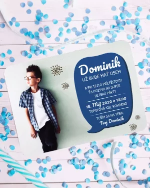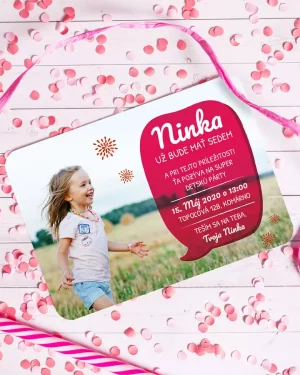 Originálna narodeninová pozvánka na detskú oslavu pre chlapcov aj dievčatá s veľkou vlastnou fotkou a bublinou s vašim textom. Na výber z dvoch farebných motívov modrej a sýto ružovej farby.