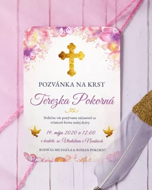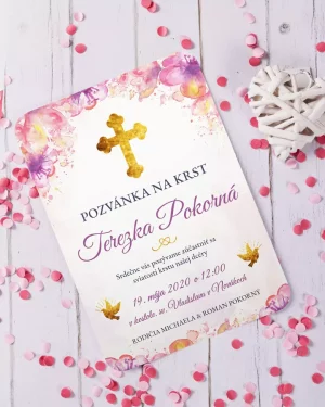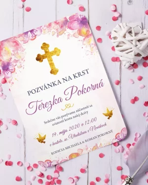 Jemná, vkusná a do bielej a ružovej farby ladená pozvánka na sviatosti ako krst, birmovka, prvé sväté prijímanie či konfirmácia. Pozvánka je tvorená krásnymi abstraktnými kvietkami v ružovej farbe s bielym pozadím a zlatými symbolmi v podobe kríža a dvoch holubičiek. Aby ste mali všetko k týmto sviatostiam zladené, ponúknuť Vám vieme tiež etikety na fľaše či pamätné magnetky v rovnakom motíve.