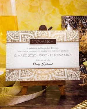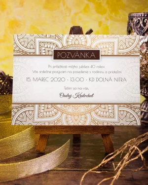 Narodeninová pozvánka s motívom retra s imitáciou zlatých dekoračných prvkov. Pozvánka je vhodná na narodeninové oslavy, výročia a iné rodinné oslavy.