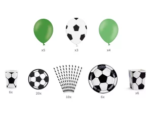 12x balón (rôzne motívy na obrázku vyššie), 20x servítka s motívom futbal, 6x pohárik s motívom futbal, 10x papierová slamka, 6x tanierik s motívom futbal, 6x krabička na popcorn / sladkosti