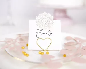 Luxusný kovový stojan na menovky v tvare srdca v zlatej metalickej farbe.