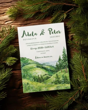 Svadobné oznámenie inšpirované krásou prírody ponúka jedinečný akvarelový motív hôr a lesa, ktorý zaujme svojou pokojnou a harmonickou atmosférou. Kombinácia jemných zelených a jesenných farieb vytvára dokonalý vizuálny zážitok pre milovníkov prírodných scenérií. Tento dizajn je ideálny pre páry, ktoré chcú svoje spojenie osláviť v súlade s krásou okolitej krajiny. Rovnaký motív je dostupný aj pre ďalšie svadobné tlačoviny, ako sú pozvánky k stolu, menovky, menu, etikety, samolepky a veľa ďalšieho.