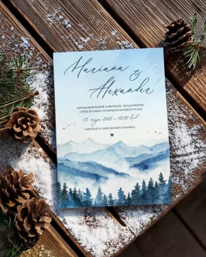Nádherne laděné svadobné oznámenie inšpirované zimnou krajinou očarí každého milovníka horskej romantiky. Modré odtiene lesa a hôr vytvárajú jemnú, ale zároveň výraznú atmosféru, ktorá pôsobí pokojne a čisto. Ideálne pre páry, ktoré plánujú zimnú svadbu alebo túžia po svadbe v prírode s originálnou vizuálnou estetikou. V rovnakom dizajne ponúkame aj pozvánky k stolu, menovky, samolepky, menu, etikety a veľa iného..