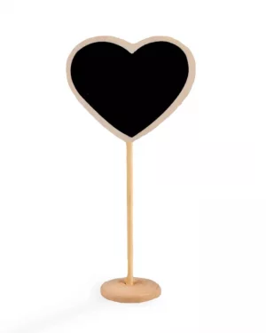 Originálna drevená tabuľka v tvare srdca na tenkom stojane so stabilnou základňou, vhodná ako menovka, popis do candy baru, cenovka do predajne a pod. Tabuľka má kriedový povrch, odporúčame písať bielou kriedou. Nápis je ľahko umývateľný vlhkou handričkou. Tabuľka sa hodí k výzdobam vo vintage, rustikálnom alebo prírodnom štýle.