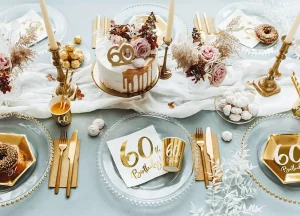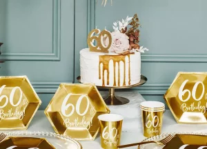 Luxusná a elegantná tortová sviečka v podobe zlatej perleťovej 60tky bude čerešničkou na narodeninovej torte. Odporúčame kombinovať aj s inými zlatými doplnkami z našej ponuky, napr. servítky, balóny, stojany na menovky, ribbony, slamky.