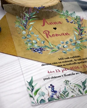 Transparentné svadobné oznámenia Eucalyptus s bylinkami