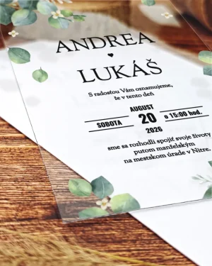 Ak sa Vaša svadba bude niesť v bielej farbe a prírodných motívoch, toto svadobné oznámenie je tu práve pre Vás. Stále viac a viac obľúbený eukalyptus veľmi jemne a vkusne dopĺňa oznámenie o Vašom veľkom dni. Svadobnú výzdobu tak môžete tiež doplniť eukalyptom, napríklad aj v nevestinej kytici, a spolu s ďalšími svadobnými tlačovinami s rovnakým motívom z našej ponuky dosiahnete veľmi vkusný, romanticky pôsobiaci a harmonický celok.
