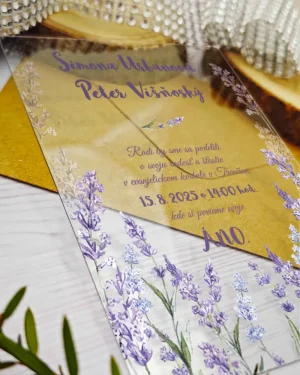 Transparentné svadobné oznámenia Levanduľa
