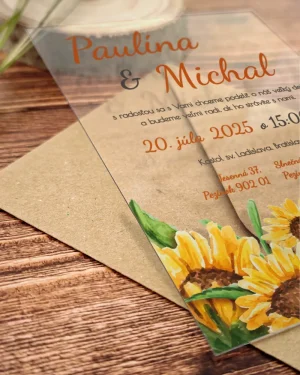 Transparentné svadobné oznámenia so slnečnicami