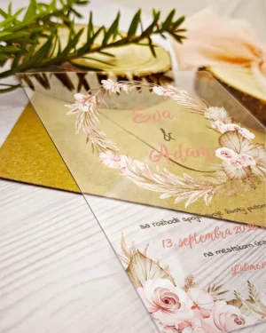 Boho štýl. Dve slová, ktoré dokonale vystihujú svadobné oznámenie Sušené kvety 01. Steblá sušenej trávy a ruže v staroružovej farbe sú dokonalým spojením, ak je Vaším snom zažiť svadbu práve v tomto štýle, ktorý je predstaviteľom nežnosti a uvoľnenosti, ale stále je veľmi šik. Svadobné oznámenie môžete doplniť rovnakými prvkami vo výzdobe a tiež tlačovinami v rovnakom motíve z našej ponuky, a všetko bude dokonalé.