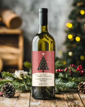 Rustikálne vianočné etikety na fľaše s výrazným čiernym stromčekom na červenom pozadí, zasypaný snehovými vločkami. Jednoduchý dizajn s vintage nádychom vytvára pocit tepla a nostalgie, ideálny pre menšie rodinné firmy, pekárne či remeselné dielne. Tieto etikety kombinuje tradíciu s prírodným šarmom. Personalizujte si texty alebo pridajte logo zdarma cez náš jednoduchý online editor.