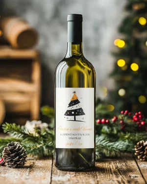 Minimalistické vianočné etikety na fľaše s geometrickým stromčekom v čiernej, oranžovej a bielej farbe na jemne bodkovanom pozadí. Elegantná a zároveň hravá farebnosť z nich robí výnimočný doplnok pre firmy, ktoré preferujú decentné dizajn – ideálne pre marketingové agentúry, dizajnérske štúdiá či technologické spoločnosti. Etikety je možné jednoducho prispôsobiť online – pridajte vlastné text alebo logo zdarma.