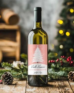 Elegantné vianočné etikety na fľaše s jemným bielym stromčekom na pastelovo ružovom podklade, doplnený vločkami a jemnými detailmi. Minimalistický dizajn navodzuje pocit čistoty a pokoja, ideálny pre kozmetické štúdiá, wellness centrá alebo kvetinárstva. Tieto etikety ponúka personalizáciu zdarma cez jednoduchý online editor – možnosť upraviť text alebo pridať logo podľa potrieb vašej firmy.