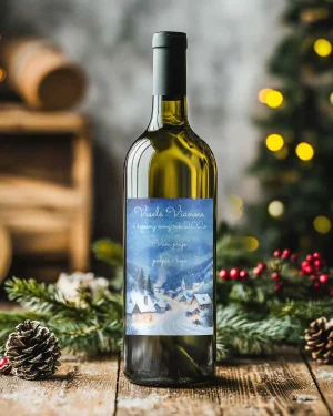 Tieto vianočné etikety na fľaše zachytáva pokoj a kúzlo zimnej noci v zasneženej dedinke. Modro-biela farebná paleta s jemnými teplými odleskami zo svietiacich okien a pouličných lámp navodzuje pocit útulnosti a tradície. Krajina s kostolom v pozadí je ideálna pre tradičné podniky, regionálne organizácie alebo rodinné farmy, ktoré si potrpia na autentickú atmosféru. Etikety môžete personalizovať podľa vašich predstáv pridaním textu či loga cez jednoduchý online editor.