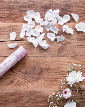 Vystreľovacie konfety s bielymi lupeňmi ruží umocnia zážitok a skvelú atmosféru každej poriadnej svadby, výročia alebo oslavy sviatku svätého Valentína.