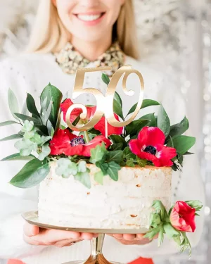 Elegantný zlatý metalický zápich do narodeninovej torty na 50. narodeniny alebo 50. výročie. Zápich odporúčame kombinovať aj s inými zlatými doplnkami z našej ponuky.